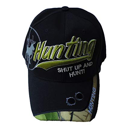 An embroidered baseball cap comes in black with leaf camo on it with Shut Up & Hunt written on it.